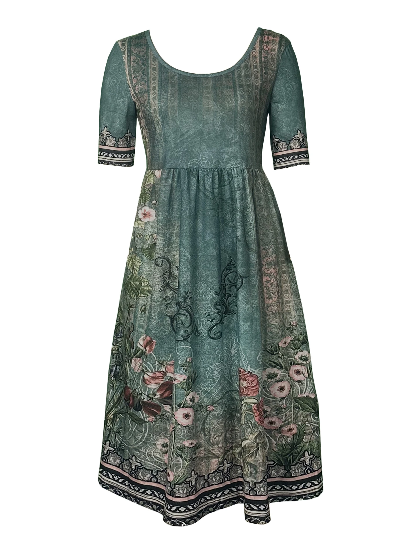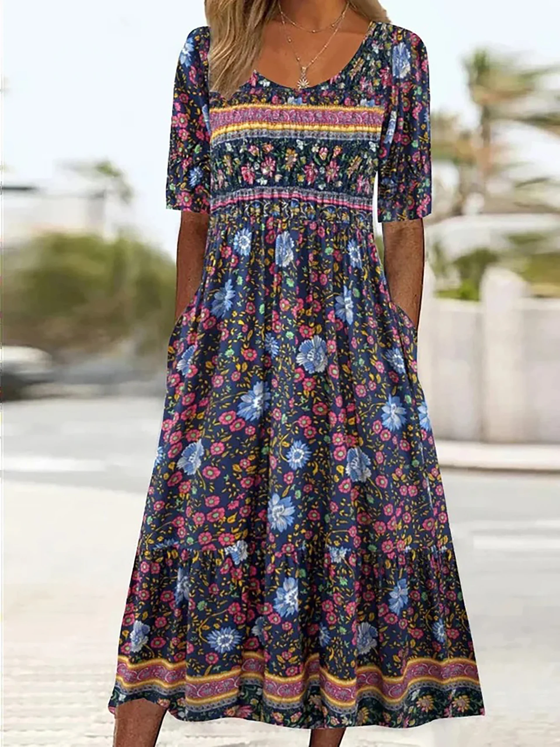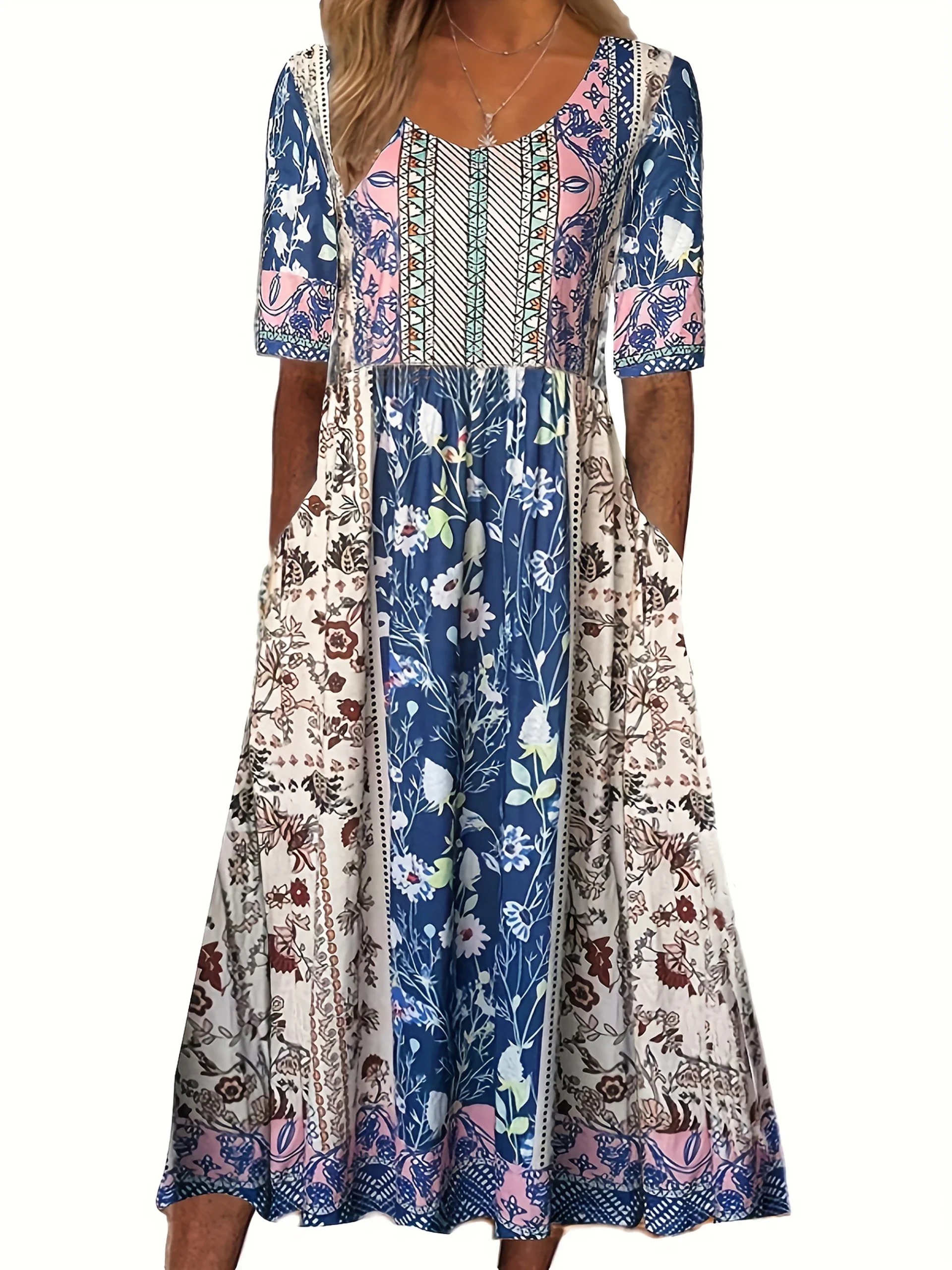 2025 summer new women’s Bohemia loose fashion print round neck short sleeve long dress