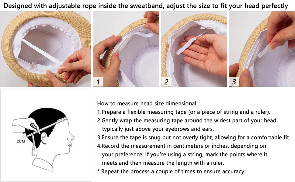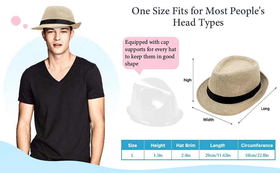 Fit the head size 7,7-1/8,7-1/4. which between 22 and 22-7/8 inches.Not waterproof, don't wash. There is a hat holder within the package. You can keep hats with a perfect shape with the holder.