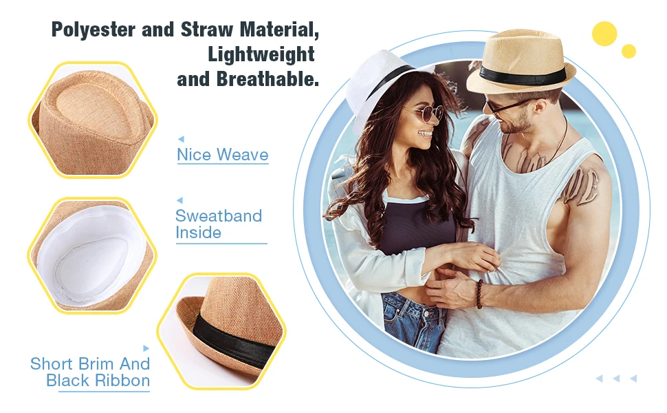 80% paper straw 20% Nylon. The materials are high quality, natural, healthy, no bad smell, breathable, lightweight, feeling comfortable when you touch, do not fade, UV Protection, so you can wear the fedora sun hats without worry.