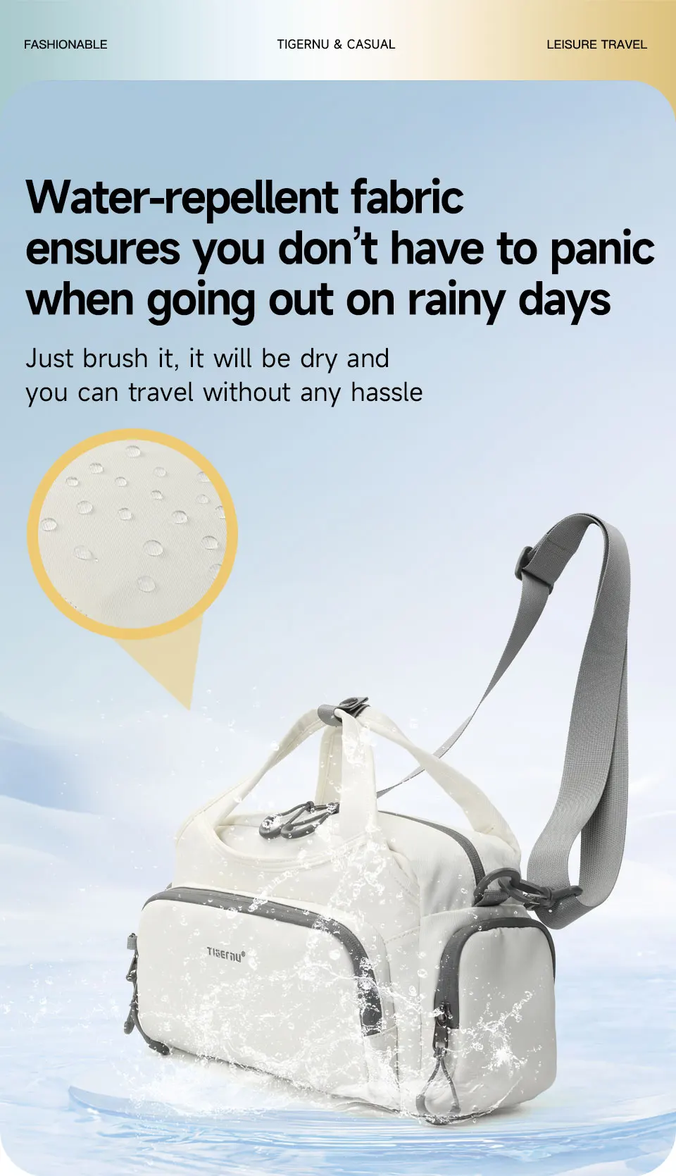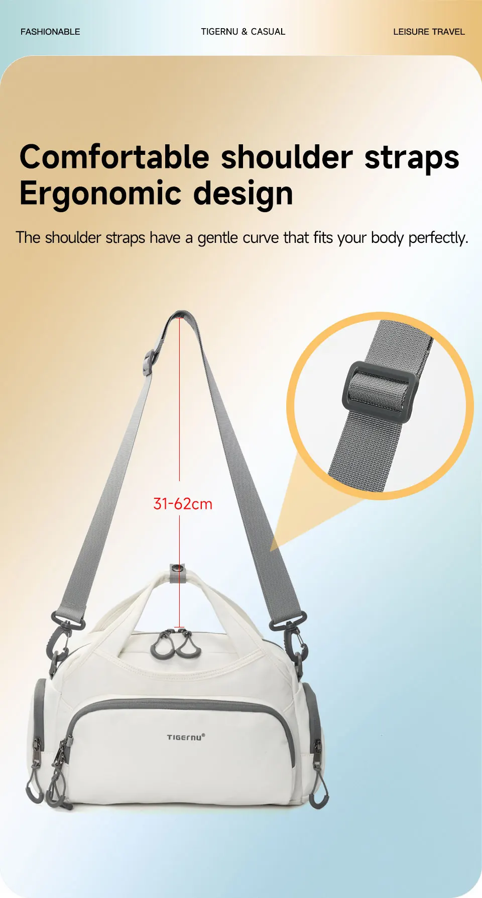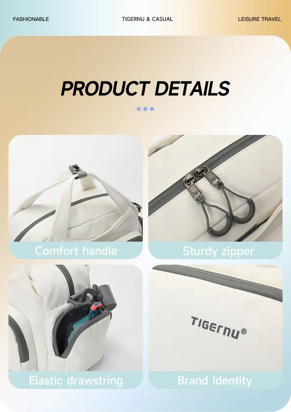 4. Other convenient details design, such as comfortable luggage strap, adjustable shoulder strap, back zipper pocket, Three types to wear and so on.
