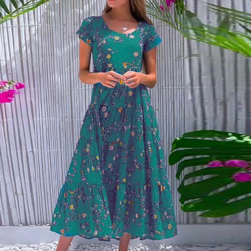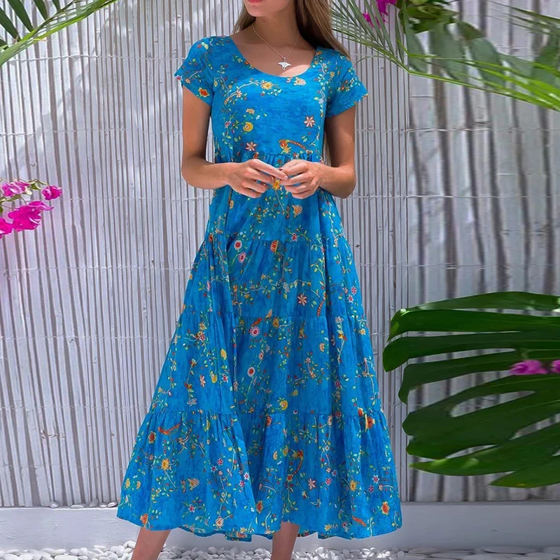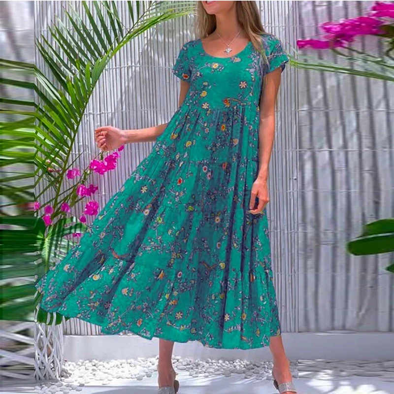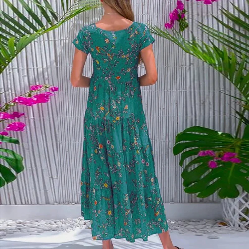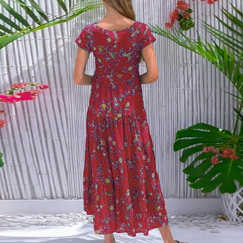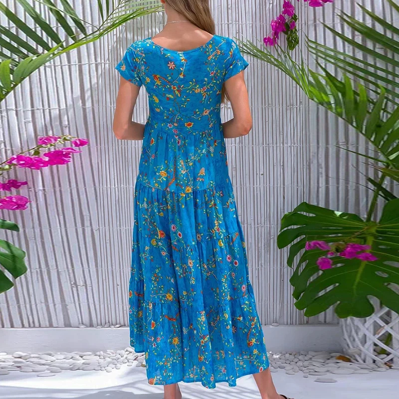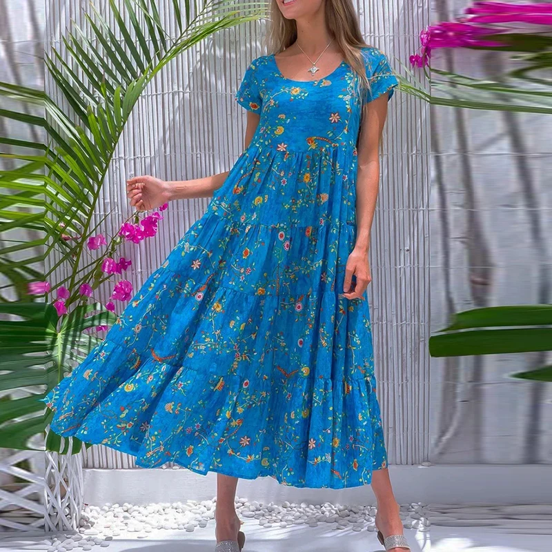 Women Flower Print Dress Boho A-Line Long Dress Women Summer Vintage Maxi Dresses Casual Loose Holiday Party Dress 2023