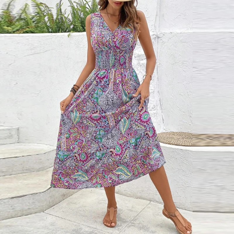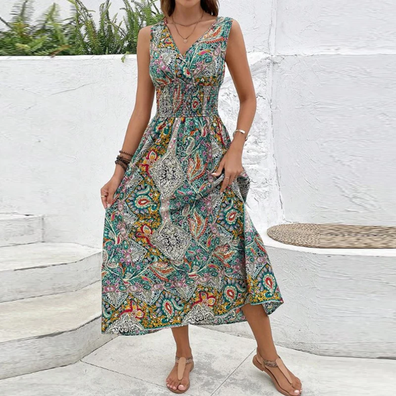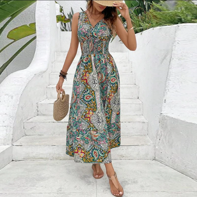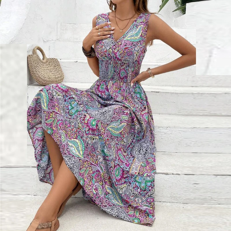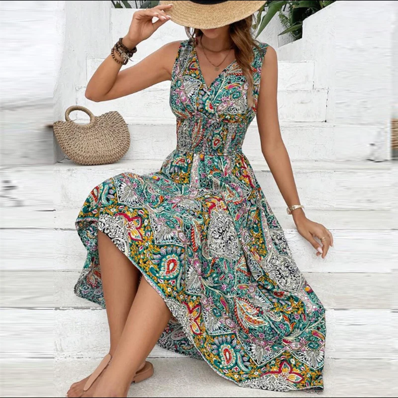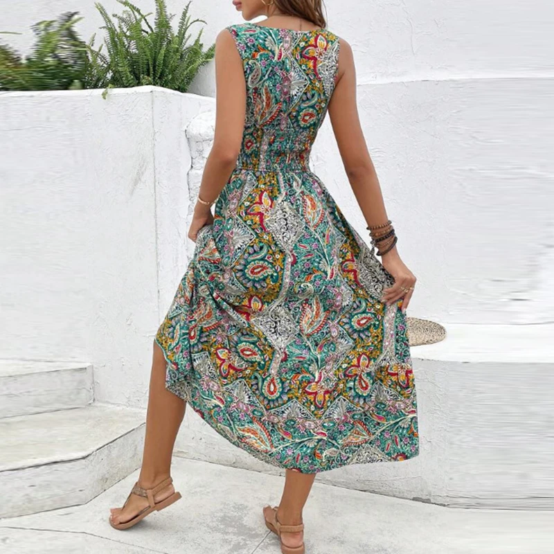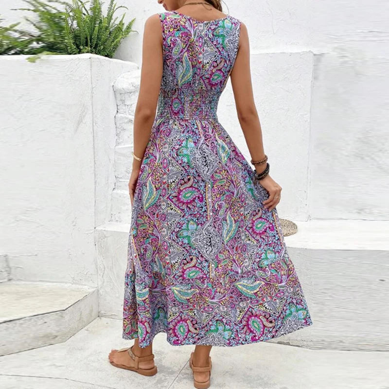 Women Flower Print Dress Boho A-Line Long Dress Women Summer Vintage Maxi Dresses Casual Loose Holiday Party Dress 2023