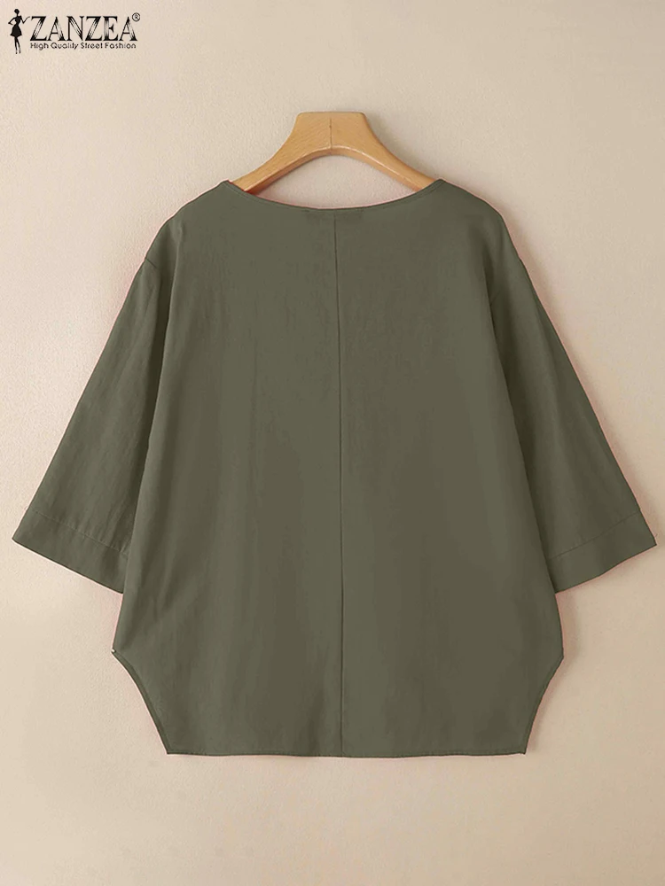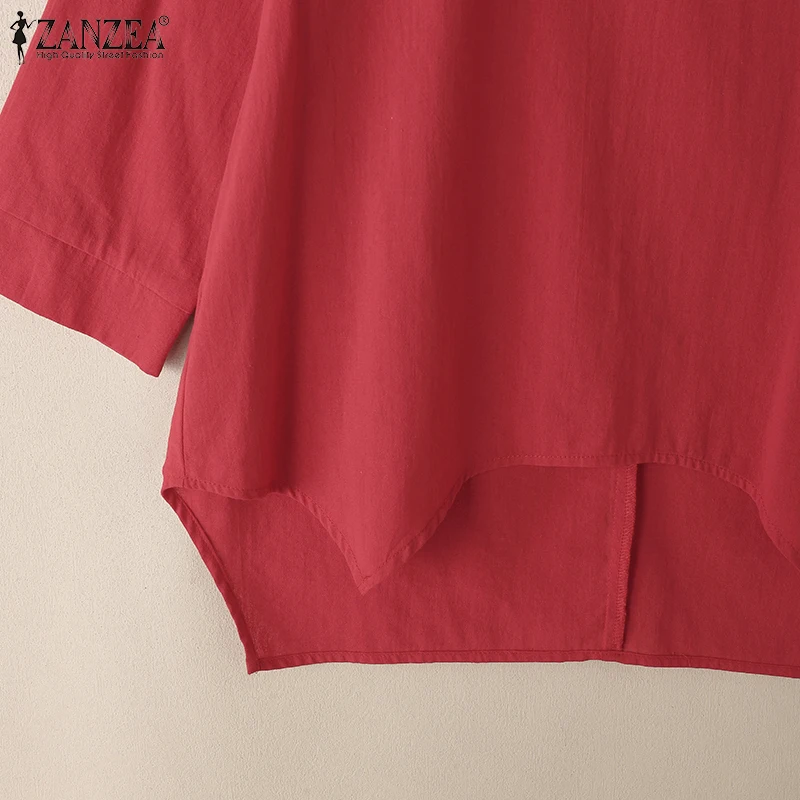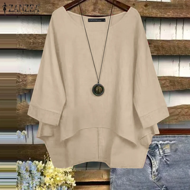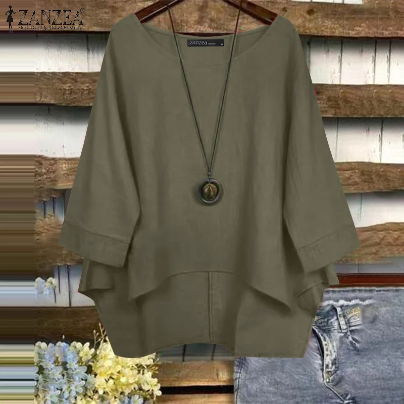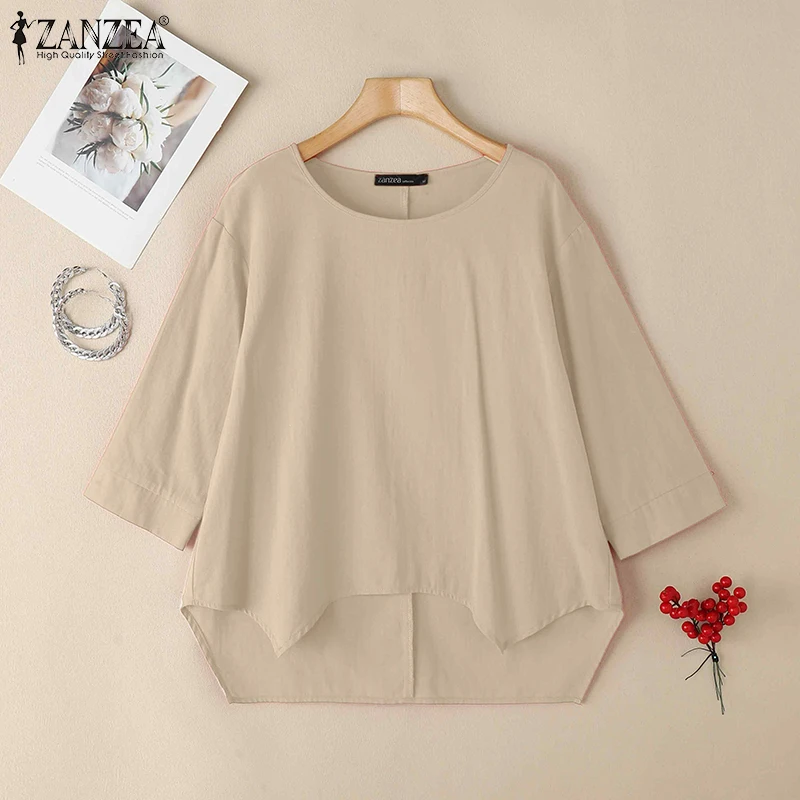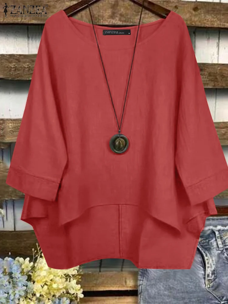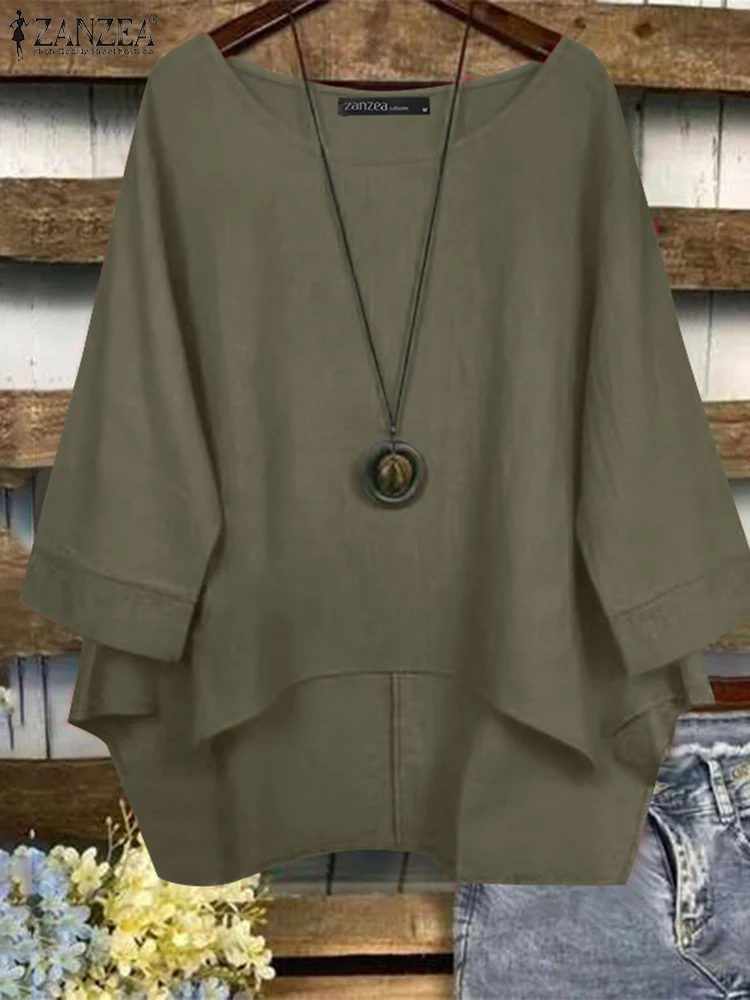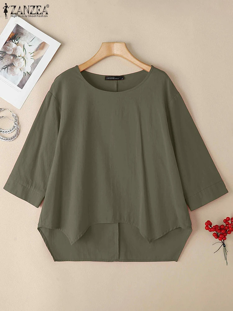 ZANZEA Casual 2025 Summer Blusas Mujer Woman Cotton Asymmetrical Hem High-Low Blouses 3/4 Sleeve Loose O-Neck Everyday Tops
