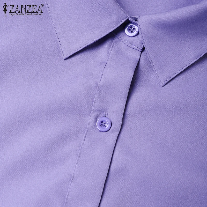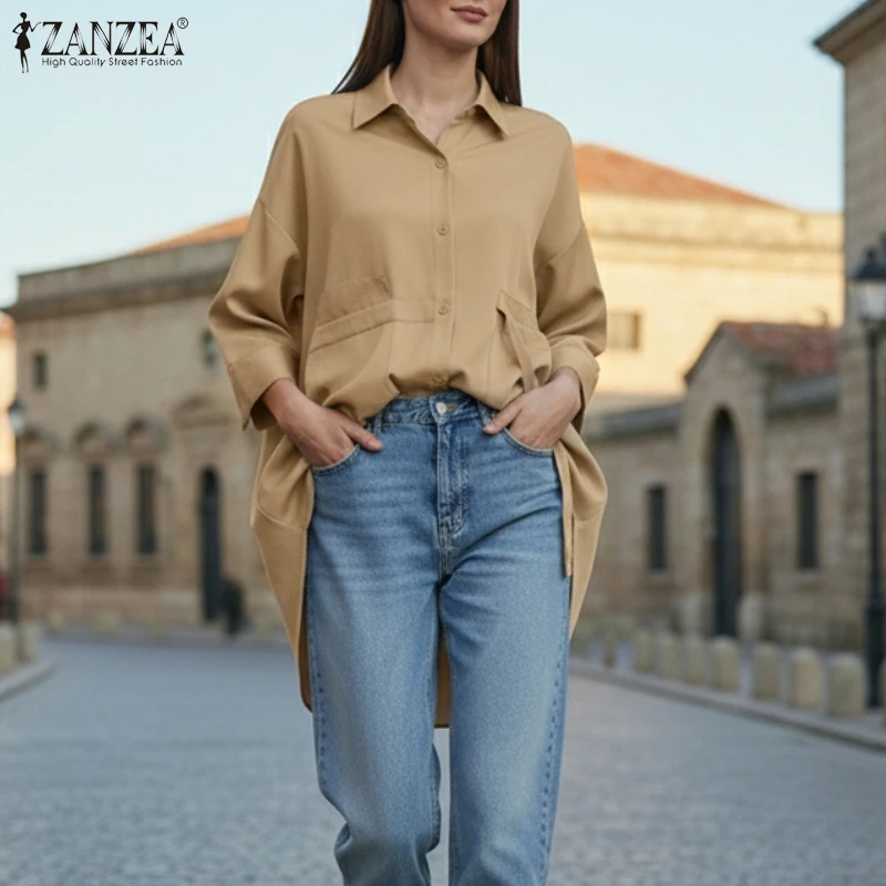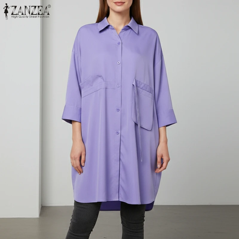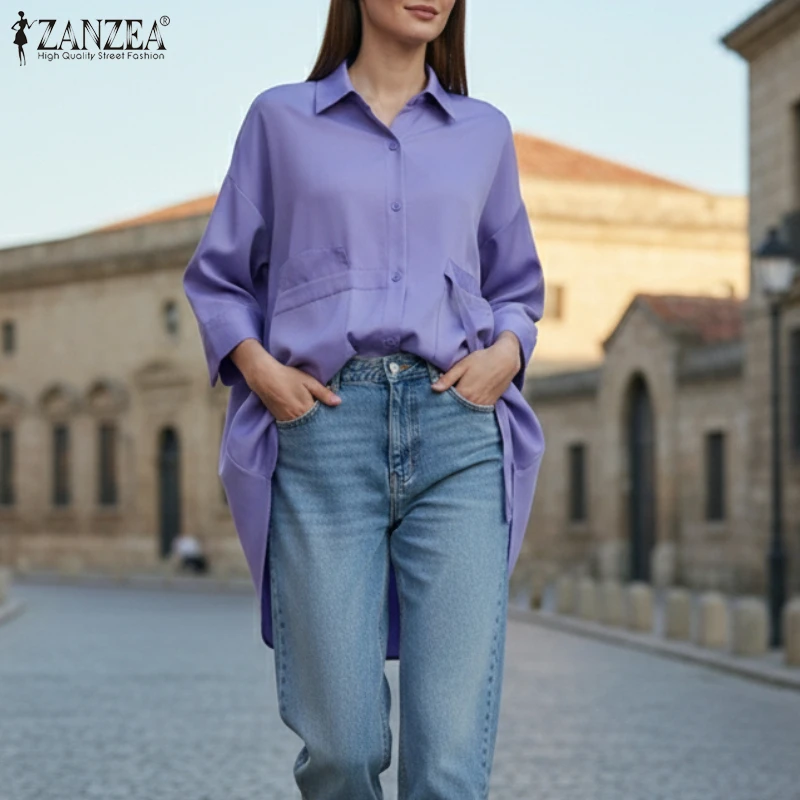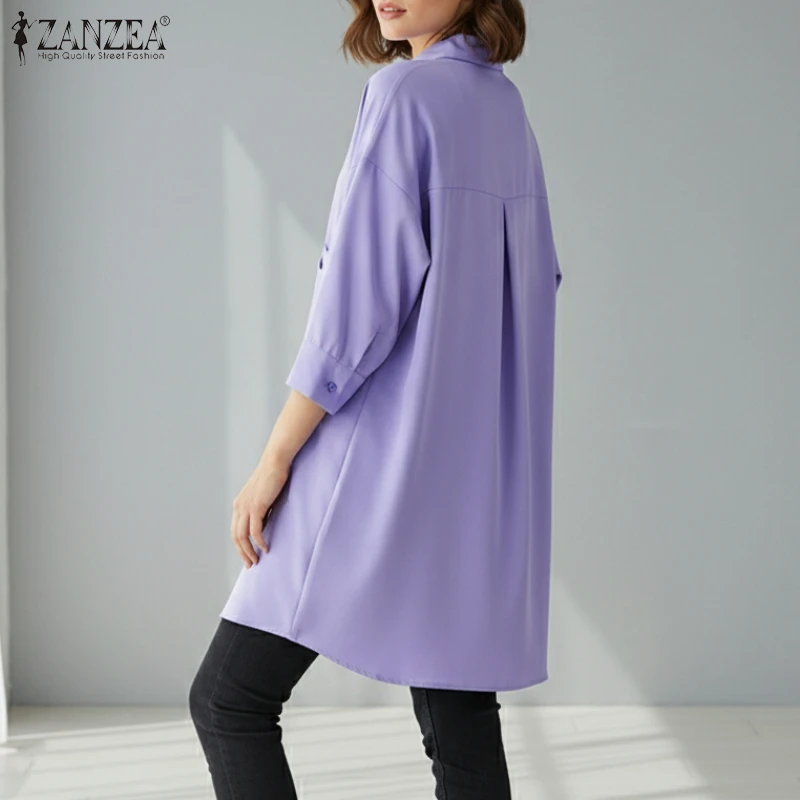 ZANZEA Plus Size Women’s Oversized Long Shirts Minimalist Casual Chic Collared Button Up Blouse Spring Baggy Chemises Femme 5XL
