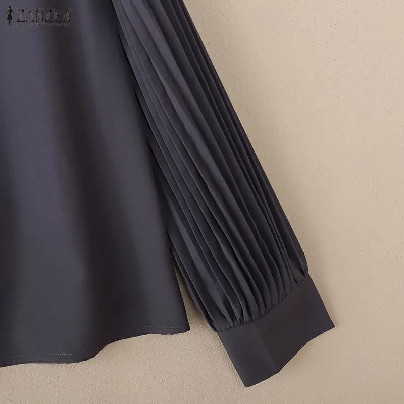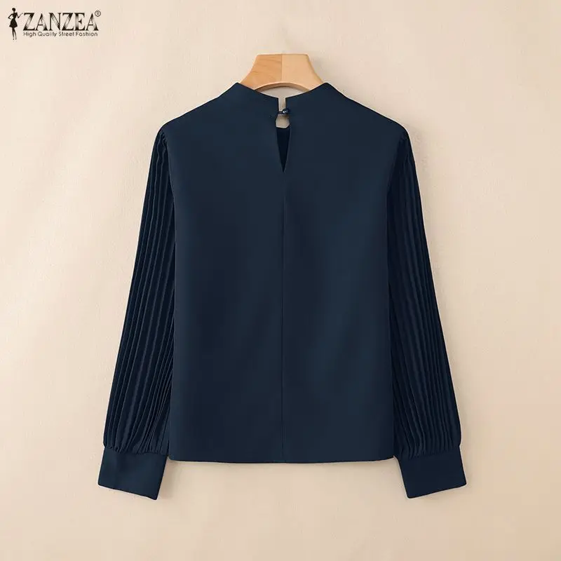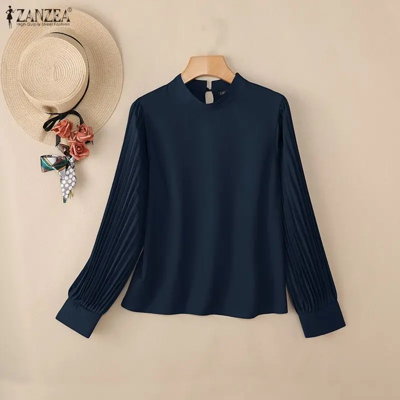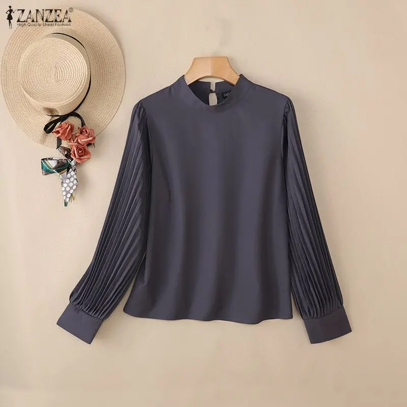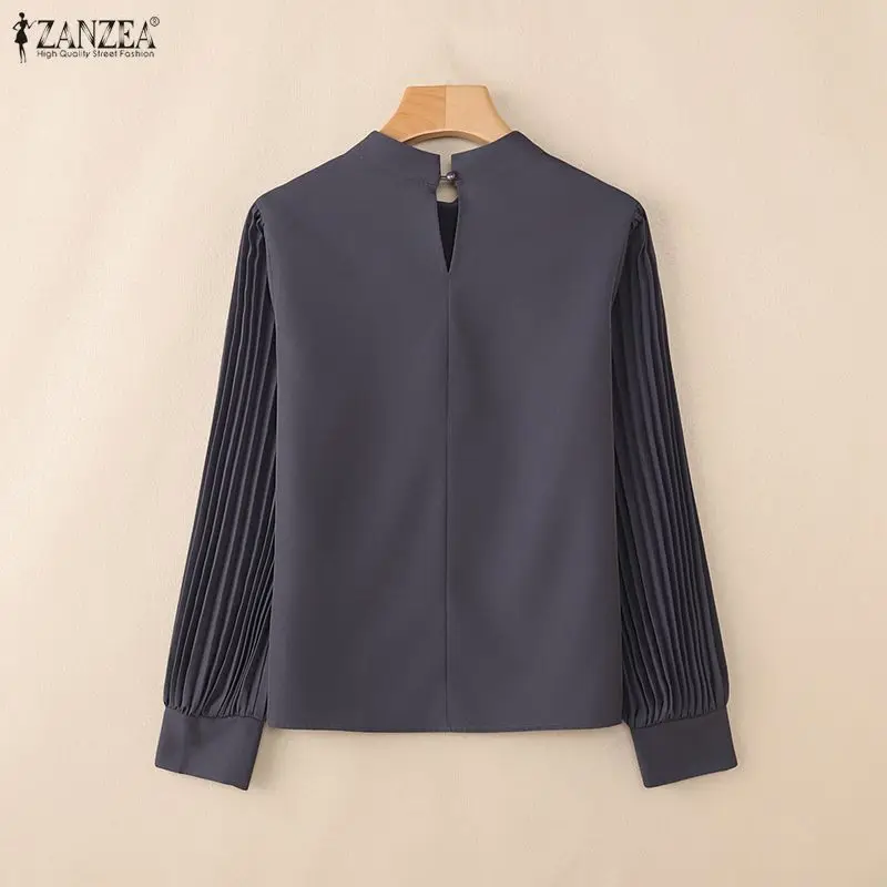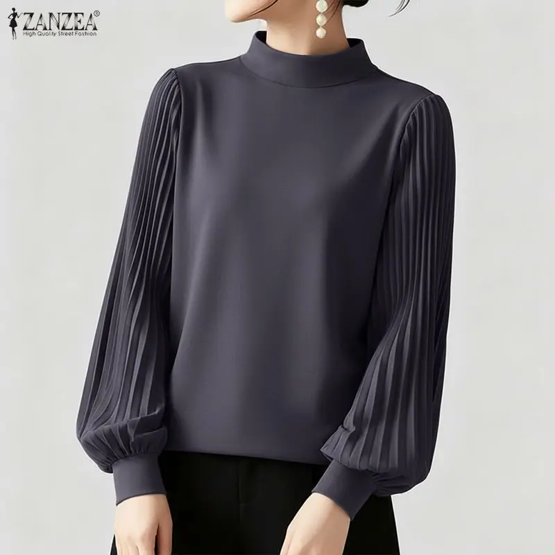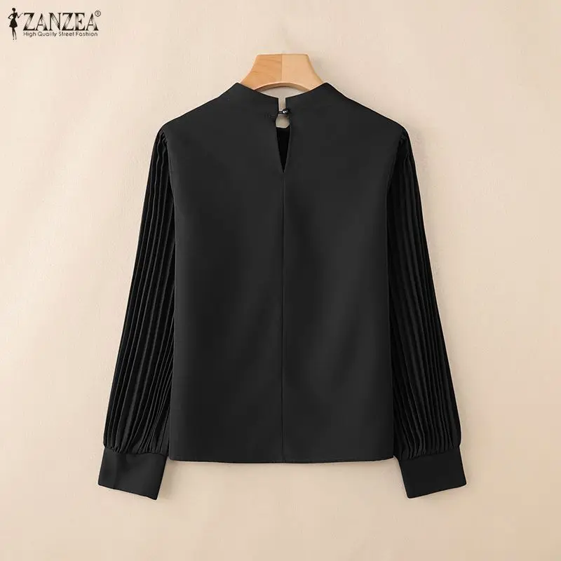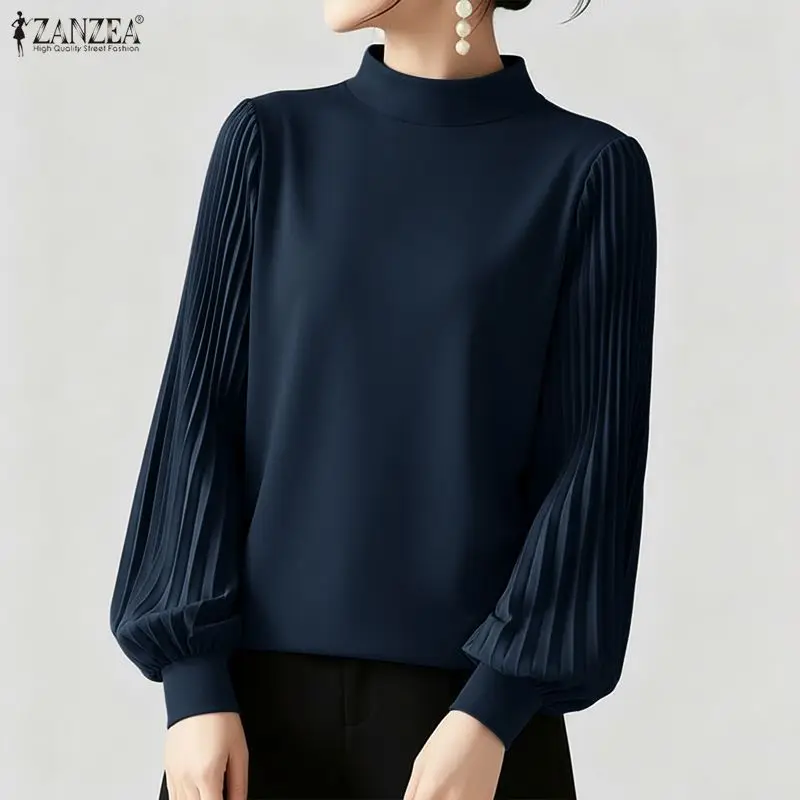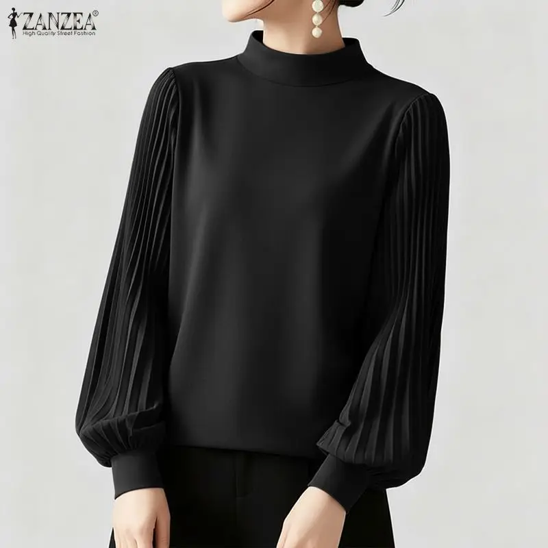 ZANZEA Spring Women’s Elegant Blouses Mock Neck Pleated Puff Sleeves Solid Color Pullover Tops Minimalist Casual Woman Clothes