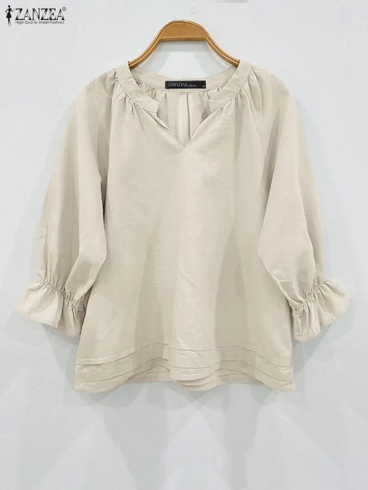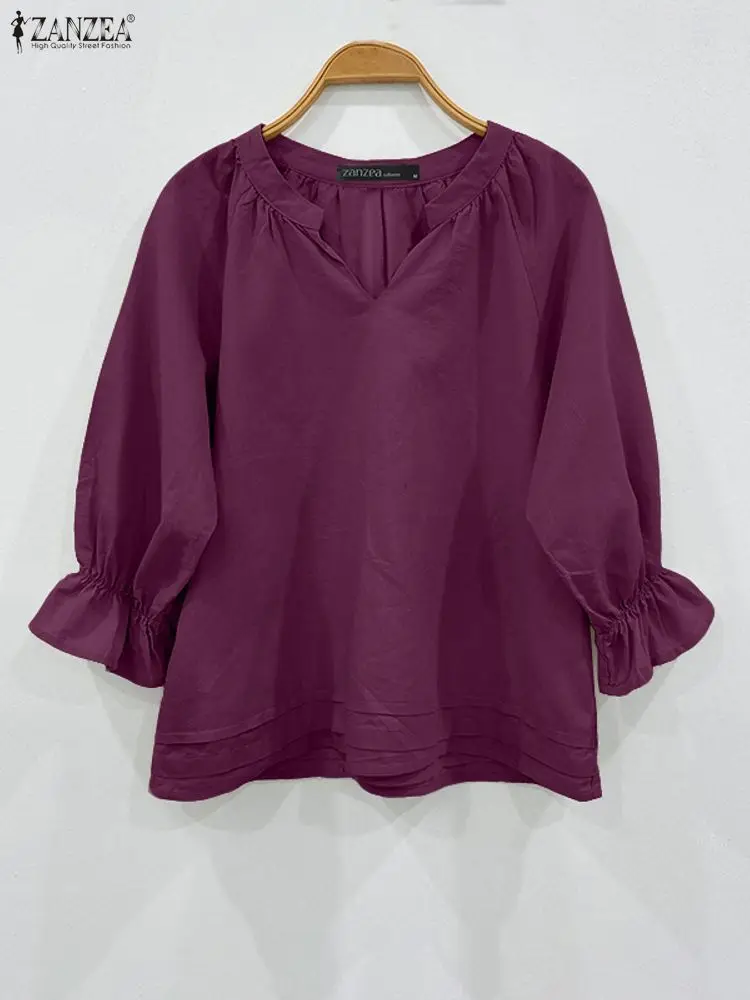 ZANZEA Women’s Casual Pintuck Hem Blouses 2025 Autumn V-Neck 3/4 Raglan Sleeve Elastic Cuffs Solid Color Pullover Tops S-3XL